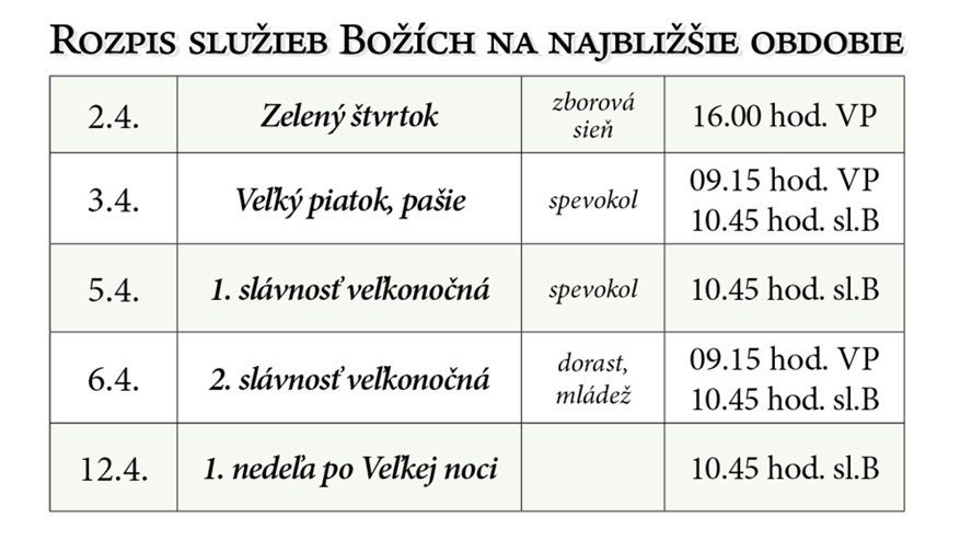 Hlavné služby Božie – 12. apríla 2026 | I. nedeľa po Veľkej Noci o 10.45 hod.