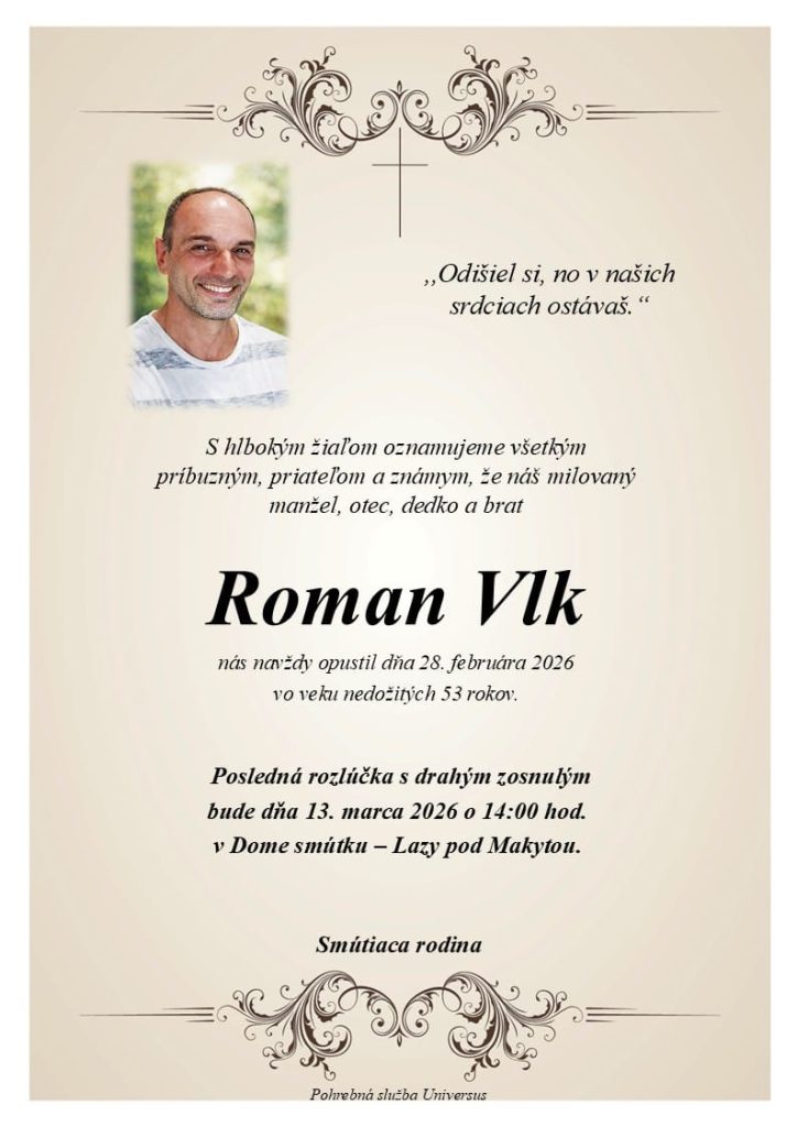 S naším drahým zosnulým sa spoločne rozlúčime v piatok 13. marca 2026 o 14.00 hod. v Dome smútku – Lazy pod Makytou.